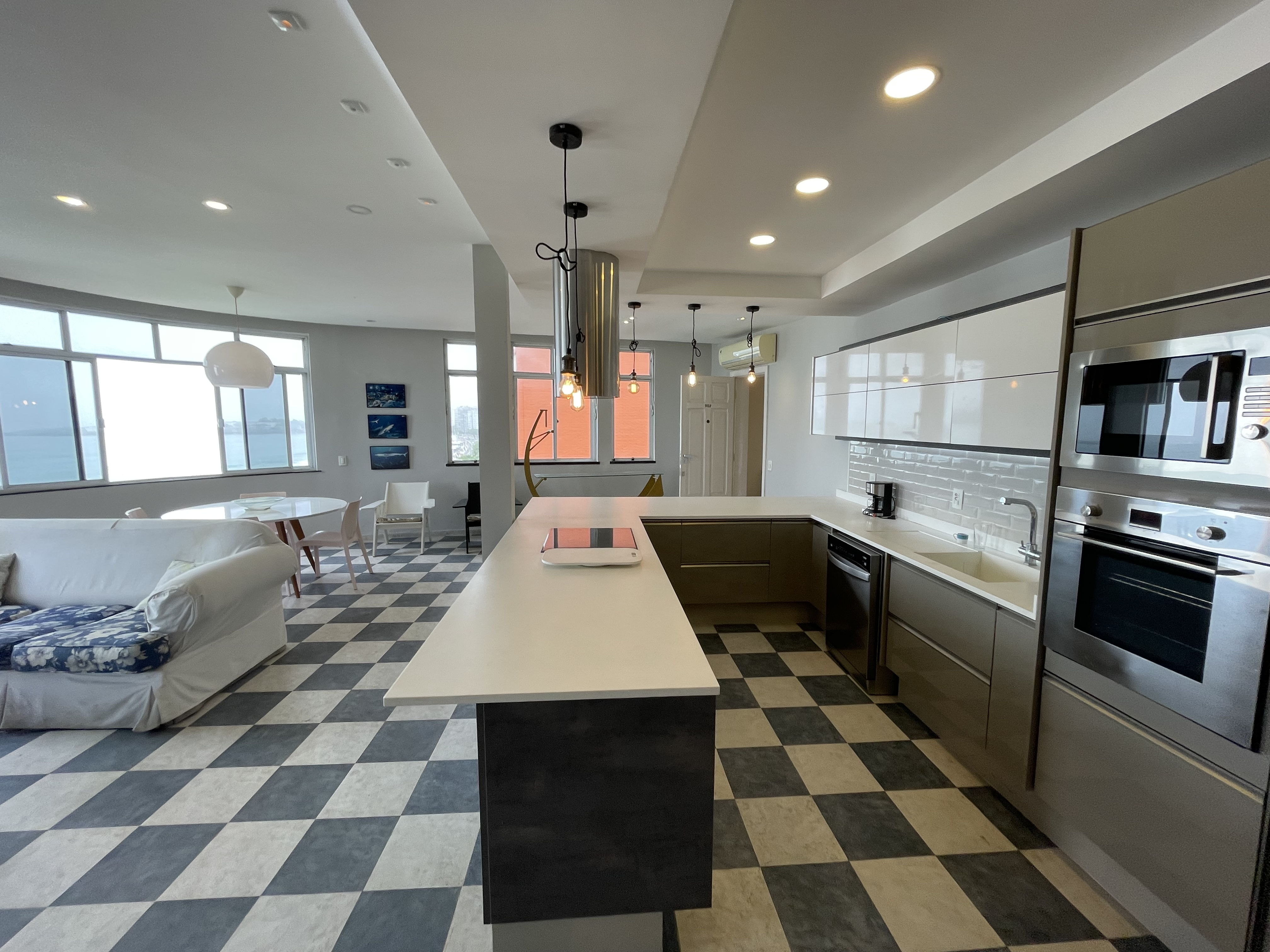 The apartment features a large open-concept kitchen with ample storage, a new refrigerator, stove, microwave, and washing machine. The spacious living and dining areas are perfect for entertaining or relaxing while enjoying the seaside view.